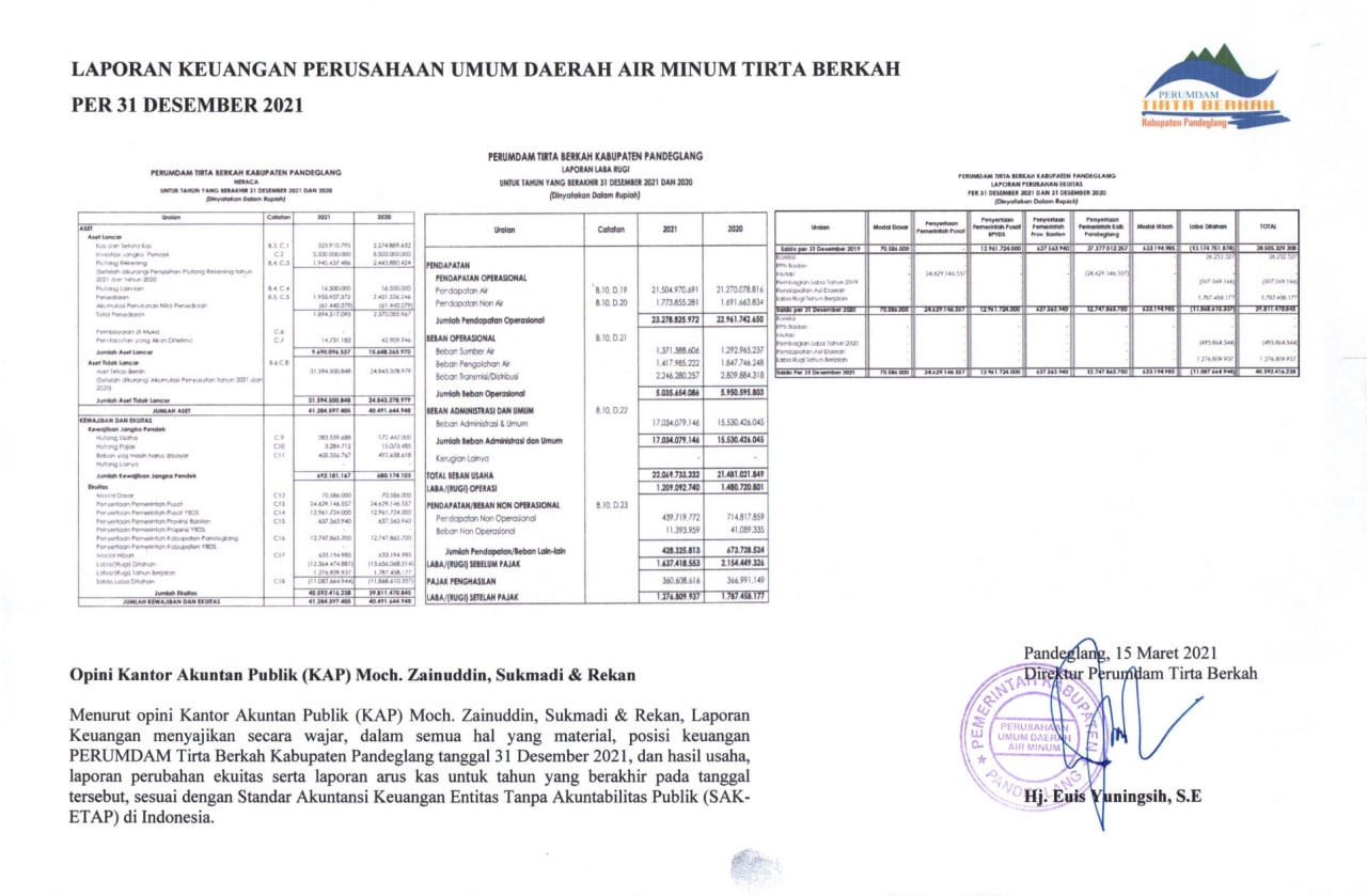Berikut kami sajikan Laporan Keuangan Perusahaan Umum Daerah Air Minum Tirta Berkah Tahun 2020